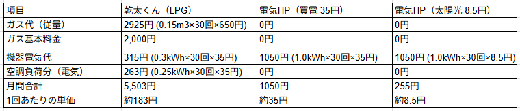 | 項目 | 乾太くん(LPG) | 電気ヒートポンプ(太陽光利用) |