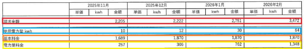 その他の月(11月〜1月)にいたっては、総額が月々2,000円台(赤囲い)という数字。 「えっ、基本料金を払いにいってるだけじゃないの?」と疑いたくなるレベルの安さです。