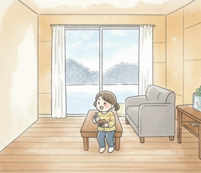 実は、床暖房は入っていません。 **「室温と同じくらいまで床の表面温度を上げること」と、「足裏から熱を奪いにくい素材(無垢材)」**を組み合わせているだけなんです。