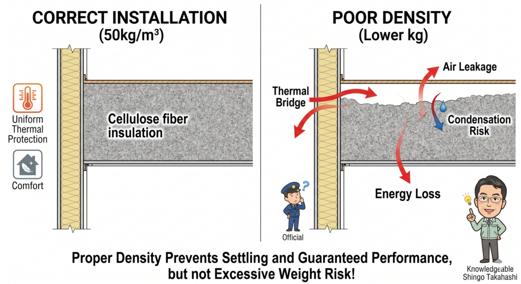 私がむしろ心配しているのは、地震よりも「断熱材が数年後に縮んで、隙間ができること」です。 密度をケチって吹き込むと、中で断熱材が沈んでしまい、そこから熱が逃げて結露の原因になることもあります。ヒートブリッジや湿気の移流ですね。