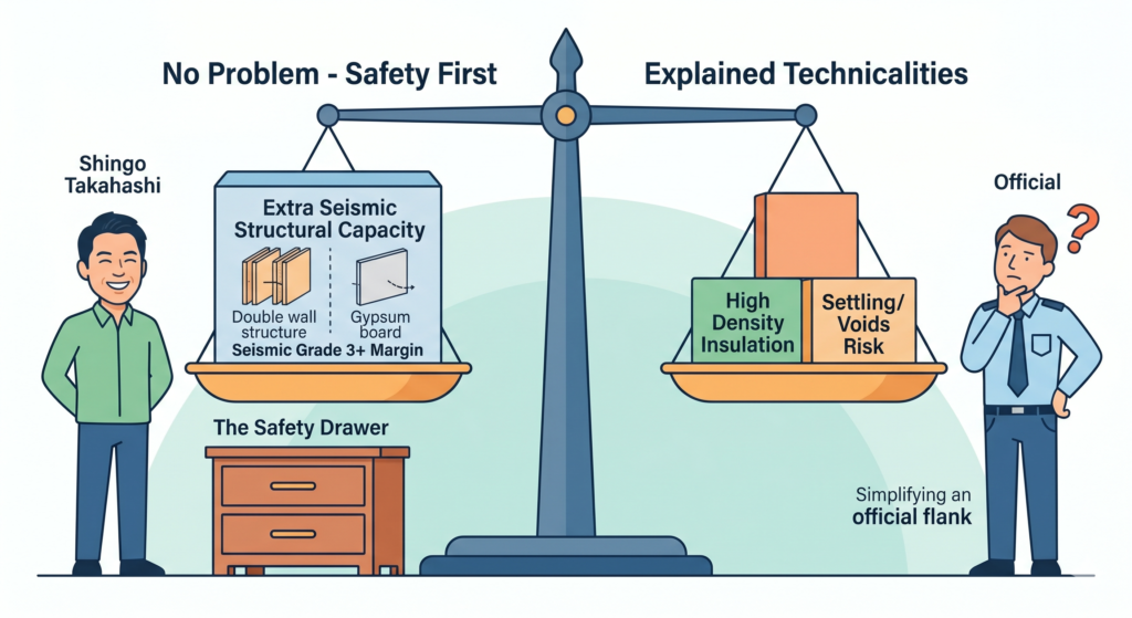 担当の方からいただいたのは、「断熱材をパンパンに詰め込むと、その重みで地震の時に不利になるんじゃないか?」という懸念でした。